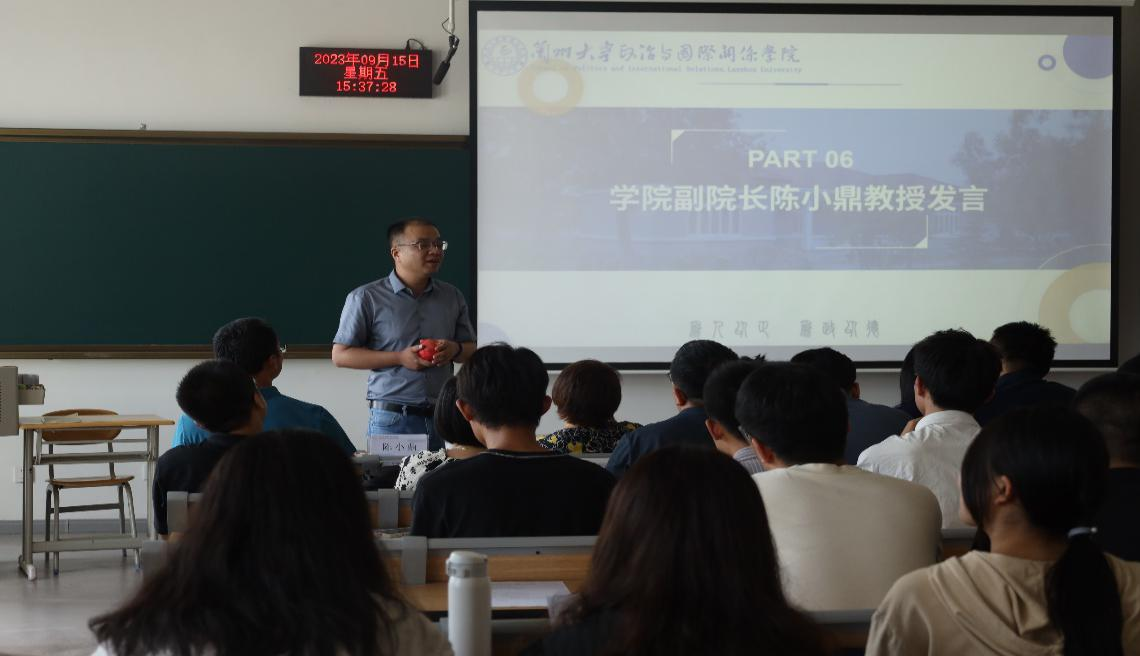 随后,导师代表周长鲜副教授致辞。首先周老师对同学们表示欢迎和祝贺,并希望大家能够适应新环境,迎接新挑战。其次周老师介绍了学院的人才培养理念。随后以命运共同体为切入点,呼吁大家团结一致,努力奋斗,担当起时代重任,并对政国院的留学生表示欢迎。