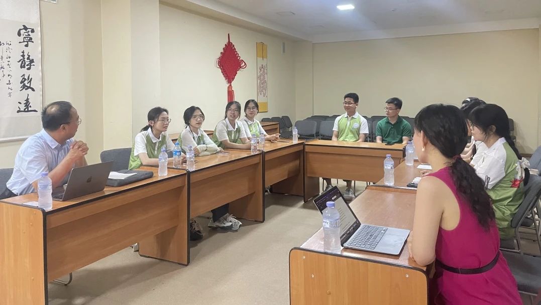 在乌兹别克斯坦国立东方大学孔子学院,训练营师生与中方院长郜宏臻围绕孔子学院在乌兹别克斯坦具体办学情况以及政国院开展乌兹别克斯坦研究的情况进行充分交流。郜院长十分关心学院乌兹别克斯坦研究中心的发展情况,并提出在乌兹别克斯坦研究中心的框架下,建议确定年度相关议题,举办中乌青年学术论坛,开展国际课程周活动,以及邀请乌方专家学者访问学院并安排高质量的讲座与课程等。学院乌兹别克斯坦研究中心副主任梁朕朋博士表达了促进双方学术交流合作方面的愿望,并诚邀郜院长参加后期进行的学术会议。此外,训练营师生还与我院在孔子学院任教的博士生韩彦雄进行了交流,韩彦雄为同学们分享了担任志愿者的心得体会。最后,学院师生参观了孔子学院,并了解HSK汉语水平考试以及乌兹别克斯坦民间中文学习情况。
